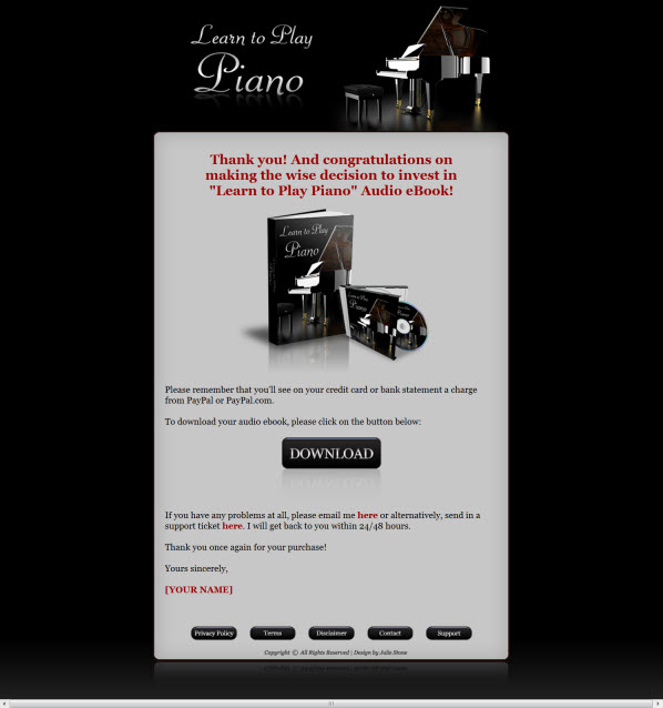 It is a product that will teach you everything you need to start having fun at the piano bench in no time at all. You can not only start your learning with "Learn to Play Piano"! You can use the same e-book to continue with your development as a musician for years to come. The lessons you learn will be that expandable and flexible. You will buy sheet music and theory books in the future, but you will never need another beginning piano guide!