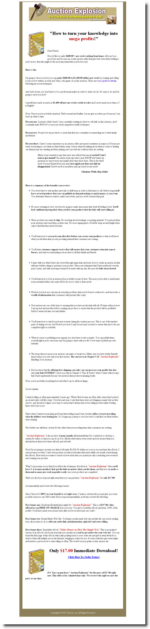 - I share with you what I have discovered through many trials and tests, how to create an auction ad that will have bidders dying to purchase your product. These are techniques that I have perfected over the past 2 years, and with each improvement I've made with my ads, the more the bids skyrocketed.