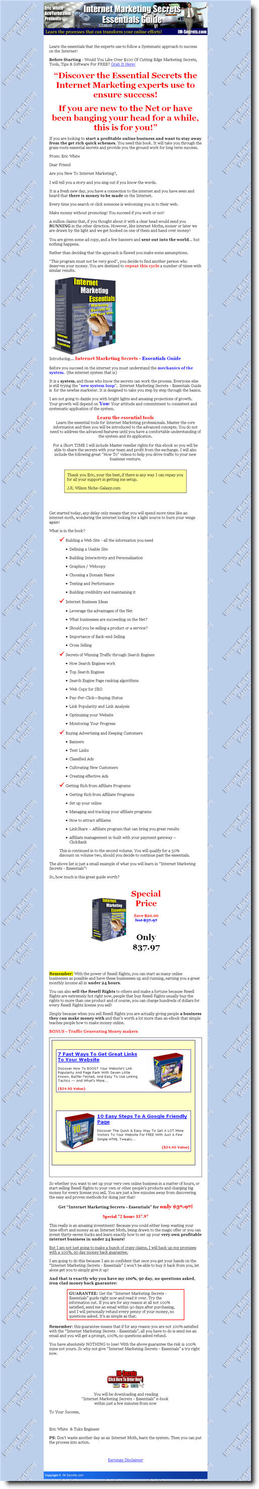 It is a system, and those who know the secrets can work the process. Everyone else is still trying the "new system loop". Internet Marketing Secrets - Essentials Guide is for the newbie marketer. It is designed to take you step by step through the basics.