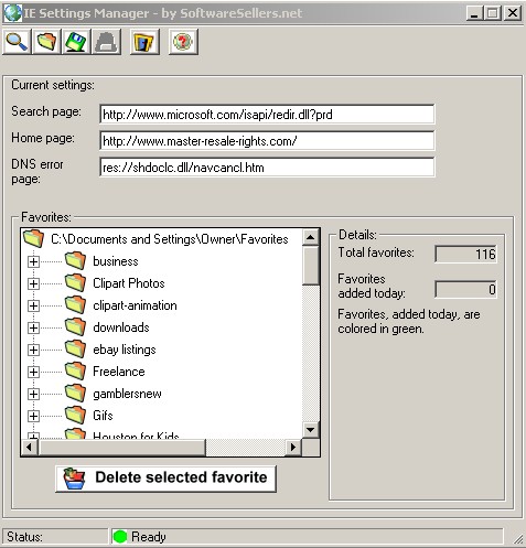 Easily access all of your Internet Explorer Settings. Customize everything there is to the popular web browser. This utility will keep your IE Settings in a easy to use program. You can view your favorites, search page, DNS error information etc.. With this program you are able to backup your settings and easily modify them without all the hassles. This software takes seconds to use. Requires IE 5 and above. | ||||||||||||||||