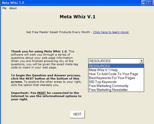 Step-by-Step Instructions- No Meta tag knowledge is necessary to run this software. In fact, Meta Whiz 1.0 will take you by the hand and will ask you each necessary question one step at a time. At the end, it will spit out the necessary code in two formats. Easy as pie.