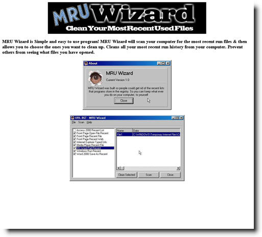 MRU Wizard is Simple and easy to use program! MRU Wizard will scan your computer for the most recent run files & then allows you to choose the ones you want to clean up. Cleans all your most recent run history from your computer. Prevent others from seeing what files you have opened.