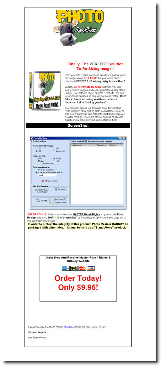 Photo Re-sizer Finally, The PERFECT Solution To Re-Sizing Images! Don't you hate it when someone emails you pictures and the image size is SO LARGE that your email client practically FREEZES UP when you try to view them! With Photo Re-Sizer software, you can easily re-size images and even specify the quality of that image. For instance, if you operate a website, you can lower image qualities so they will download faster. Don't take a chance on losing valuable customers because of slow loading graphics! You can add images via drag and drop, by selecting "Add images" or by adding them from a folder. You can also select an image and calculate what the file size will be after resizing. There are pre-set options of size and quality or you can enter your own custom settings. |