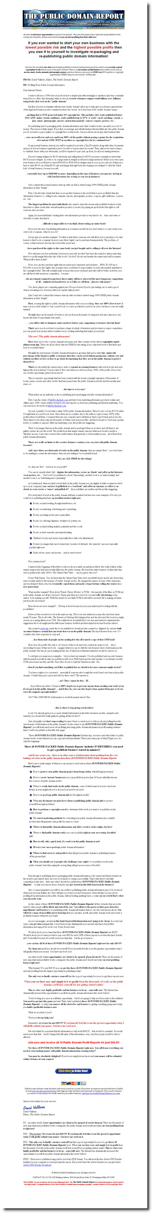 "If you ever wanted to start your own business with the lowest possible risk and the highest possible profits then you owe it to yourself to investigate re-packaging and re-publishing public domain information!"