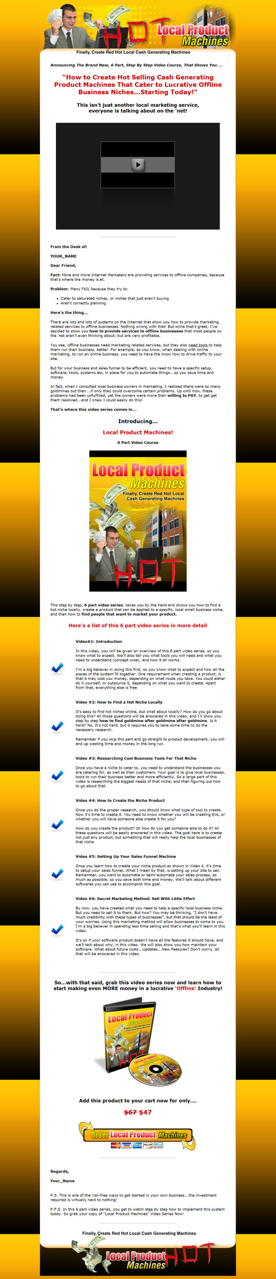 This step by step, 6 part video series, takes you by the hand and shows you how to find a hot niche locally, create a product that can be applied to a specific, local small business niche, and then how to find people that want to market your product.