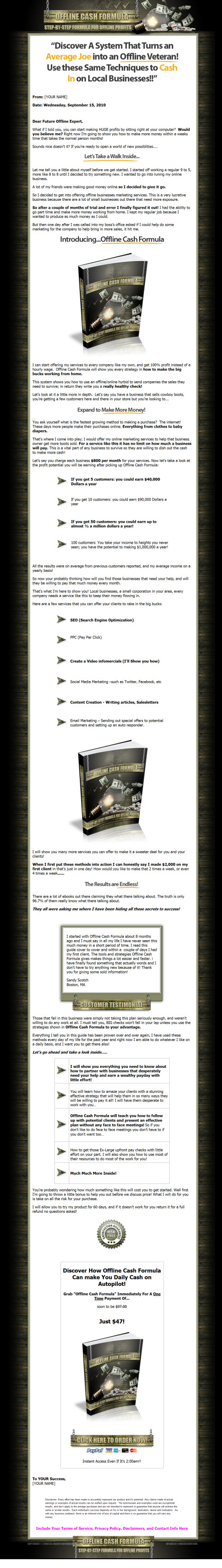 - Offline Cash Formula will teach you how to follow up with potential clients and present an effective plan without any face to face meetings! So if you don’t like to do face to face meetings you don’t have to if you don’t want too…