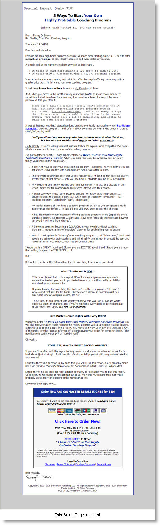 - 3 different ways to start your own coaching program - including one method that you can get started using TODAY with nothing more than a salesletter in place.