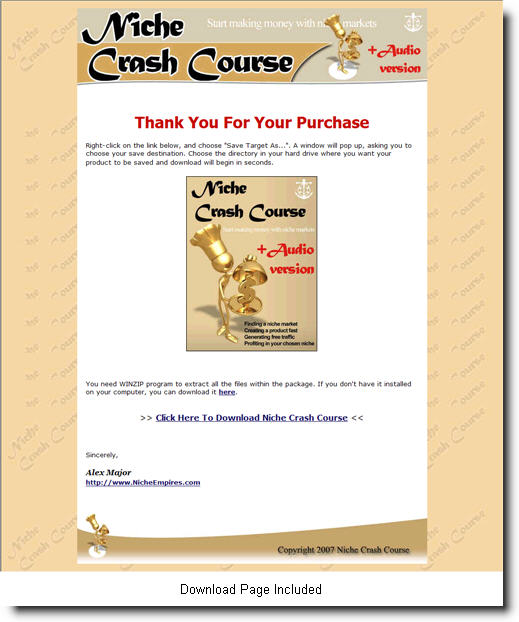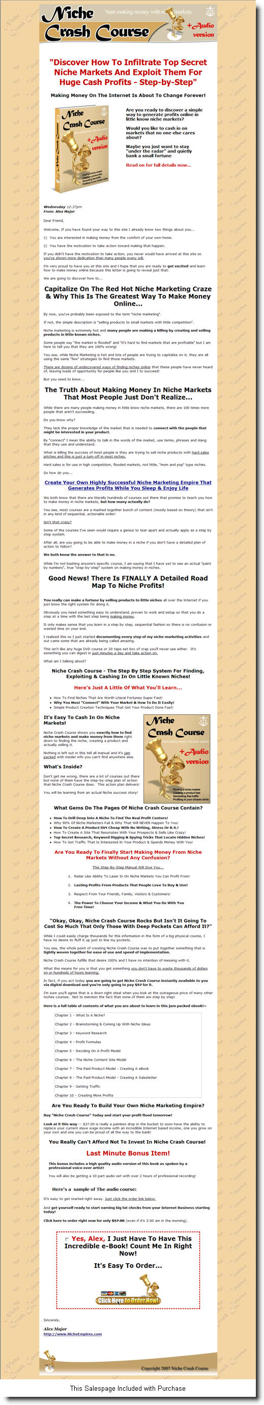 - Niche Crash Course shows you exactly how to find niche markets and make money from them right down to finding the niche, creating a product and actually selling it.