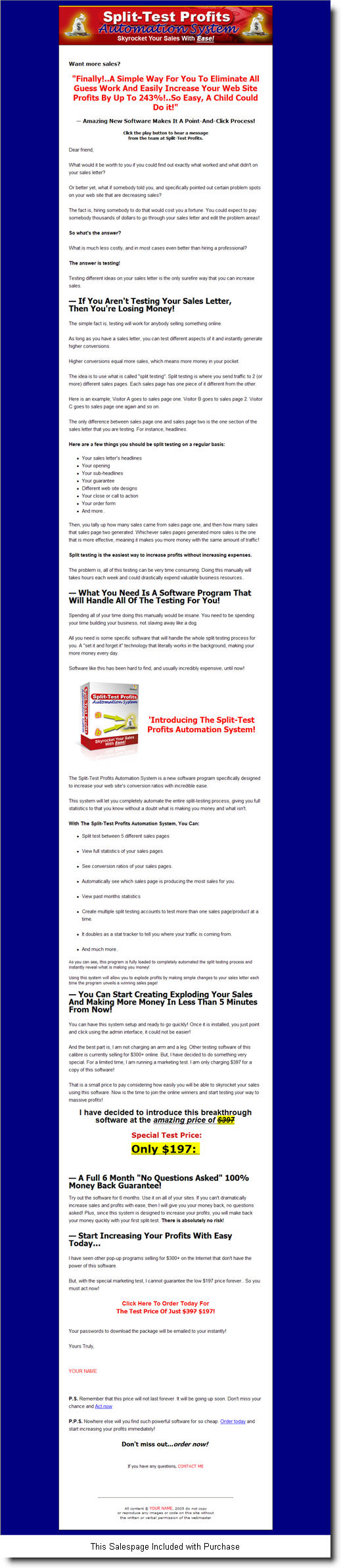 The Split-Test Profits Automation System is a new software program specifically designed to increase your web site's conversion ratios with incredible ease.