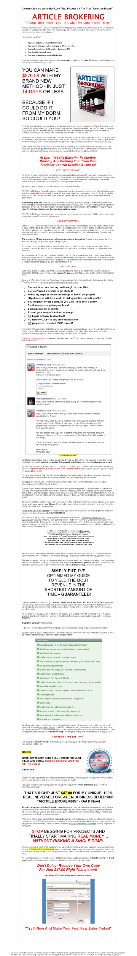 Don't worry: thanks to “Article Brokering,” now you don’t have to make all the costly, time-consuming mistakes I once made. That's because I’ve devised a formula for success and it's been time-tested since its conception in 2006.