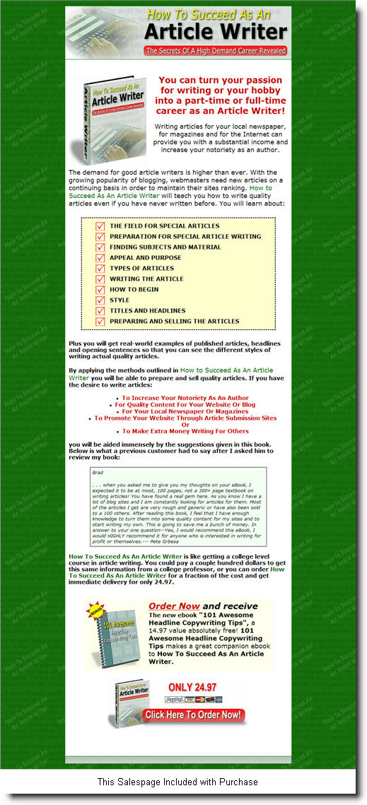 The demand for good article writers is higher than ever. With the growing popularity of blogging, webmasters need new articles on a continuing basis in order to maintain their sites ranking. How to Succeed As An Article Writer will teach you how to write quality articles even if you have never written before.