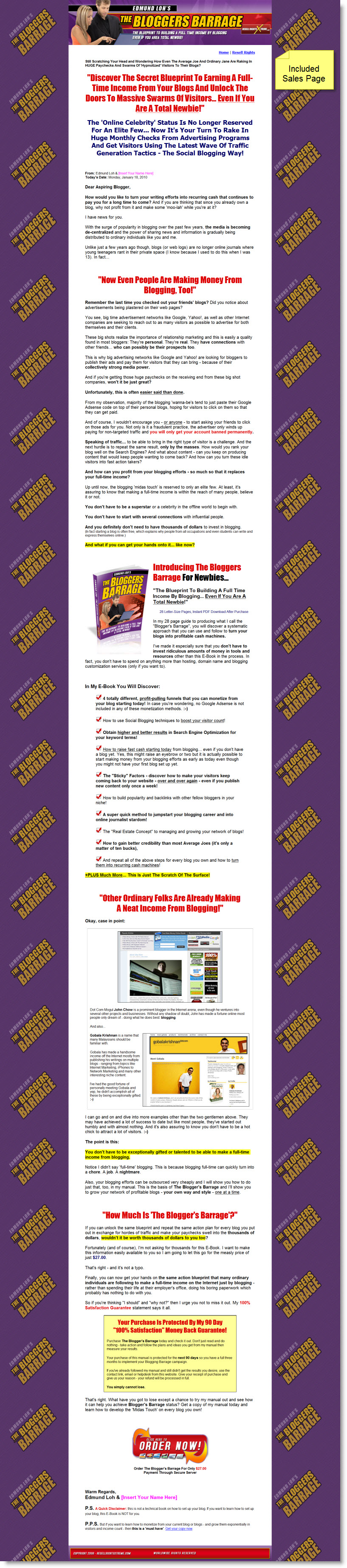 In my 28 page guide to producing what I call the "Blogger's Barrage", you will discover a systematic approach that you can use and follow to turn your blogs into profitable cash machines.