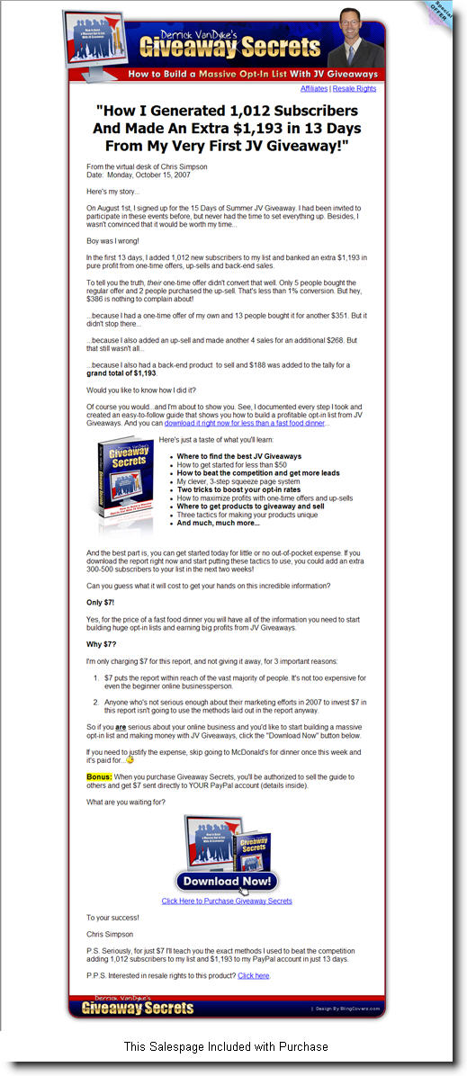 Of course you would...and I'm about to show you. See, I documented every step I took and created an easy-to-follow guide that shows you how to build a profitable opt-in list from JV Giveaways. And you can download it right now for less than a fast food dinner...