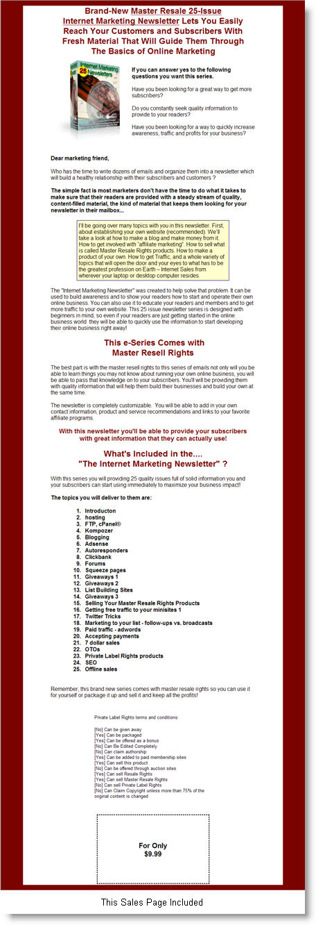The "Internet Marketing Newsletter" was created to help solve that problem. It can be used to build awareness and to show your readers how to start and operate their own online business. You can also use it to educate your readers and members and to get more traffic to your own website. This 25 issue newsletter series is designed with beginners in mind, so even if your readers are just getting started in the online business world they will be able to quickly use the information to start developing