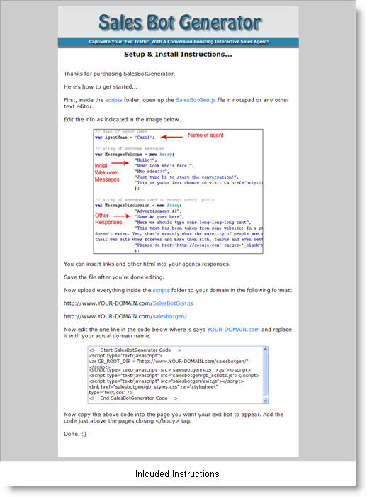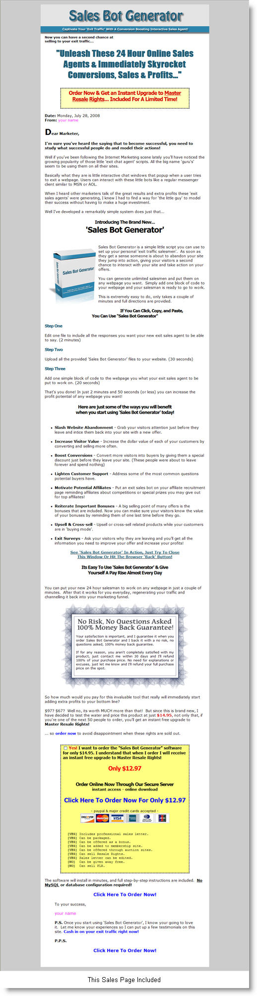 Sales Bot Generator is a simple little script you can use to set up your personal 'exit traffic salesmen'. As soon as they get a sense someone is about to abandon your site they jump into action, giving your visitors a second chance to interact with your site and take action on your offers.