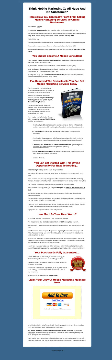 You can download Mobile Marketing Madness today, cutting your learning curve to a minimum, and you can soon be contacting offline businesses to close lucrative deals with them.