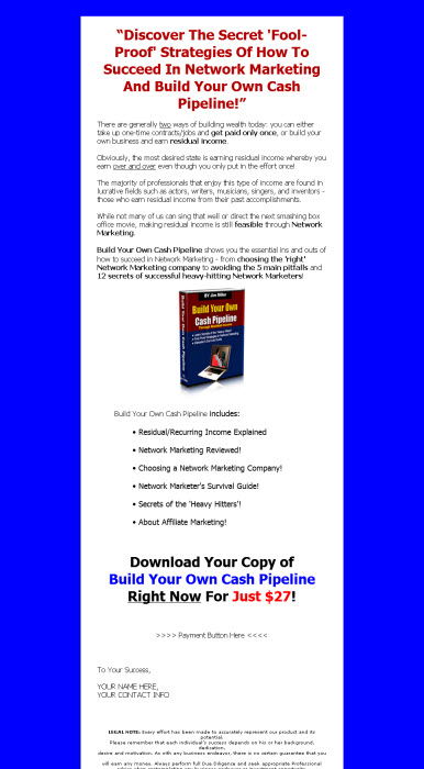 Build Your Own Cash Pipeline shows you the essential ins and outs of how to succeed in Network Marketing - from choosing the 'right' Network Marketing company to avoiding the 5 main pitfalls and 12 secrets of successful heavy-hitting Network Marketers!