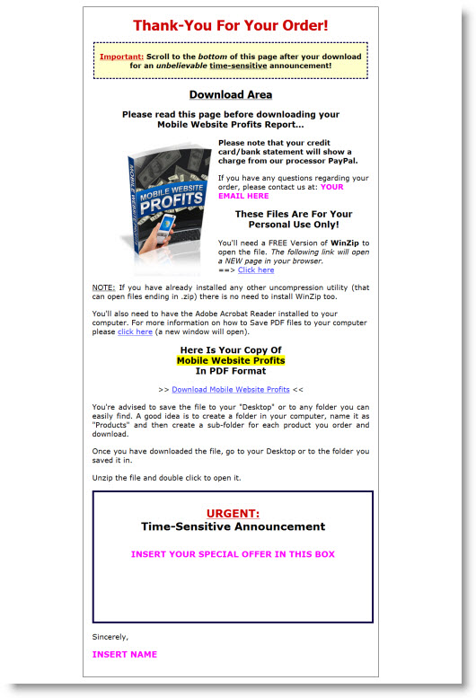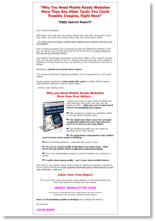 So I’ve written a Special Report, “Mobile Website Profits”, which you can easily choose to download. I’ll warn you, it’s not techno-heavy: If you’re expecting a “how to” manual on mobile XHTML, this really isn’t the product for you.
