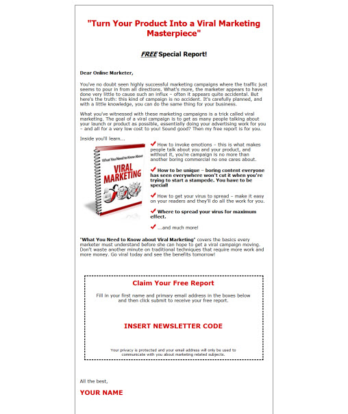 This quick-read, lay-it-on-the-line Special Report gives you all the basics to help you get your viral campaign rolling. It covers things like: