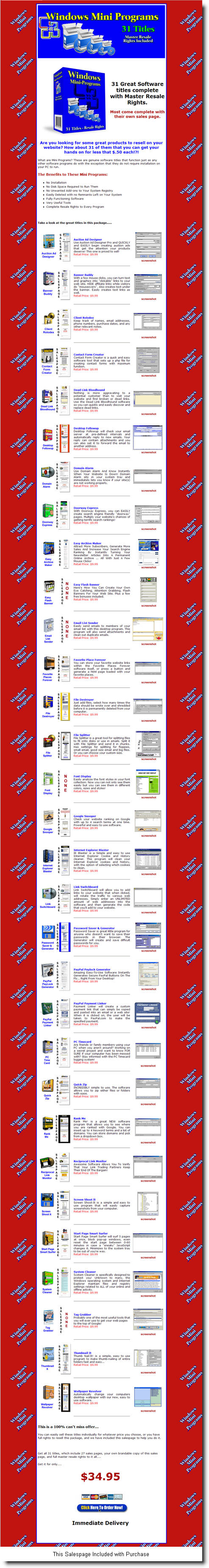 Get all 31 titles, which includes 27 sales pages, your own brandable copy of this sales page, and full master resale rights to it all.
