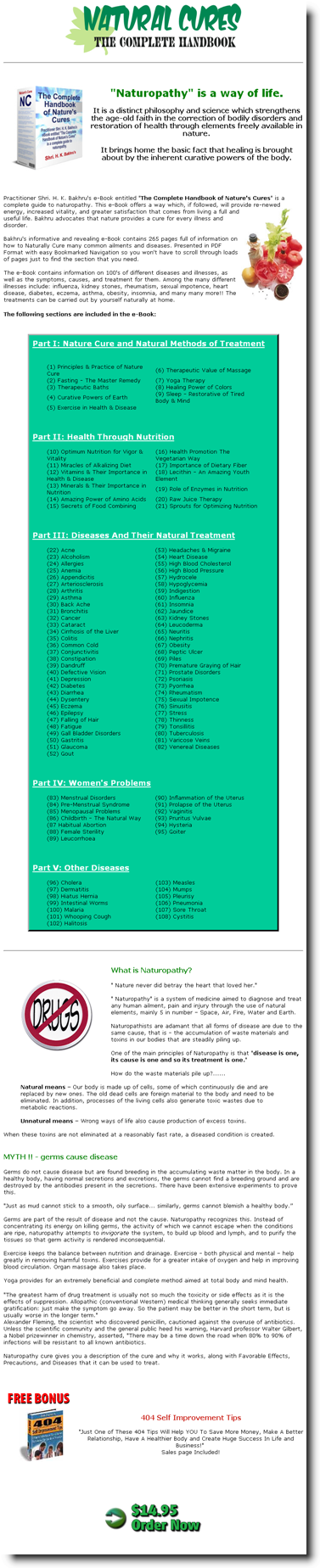 Practitioner Shri. H. K. Bakhru's e-Book entitled "The Complete Handbook of Nature's Cures" is a complete guide to naturopathy. This e-Book offers a way which, if followed, will provide re-newed energy, increased vitality, and greater satisfaction that comes from living a full and useful life. Bakhru advocates that nature provides a cure for every illness and disorder. | |||||||||||||||||||||||||||||||||||||||||||||||||||||||||||||||||||||||||||||||||||||||||||||||||||||||||||||||||