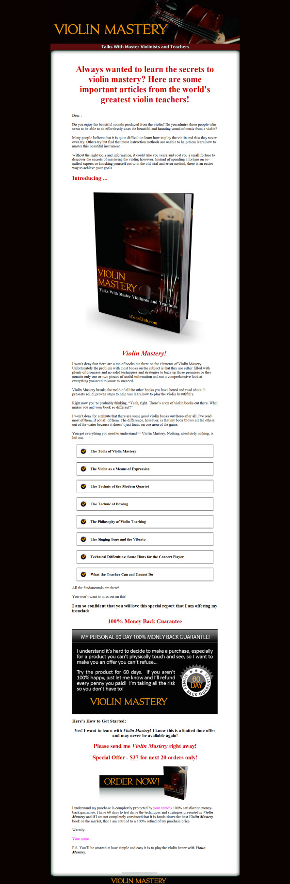 I won’t deny that there are a ton of books out there on the elements of Violin Mastery. Unfortunately the problem with most books on the subject is that they are either filled with plenty of promises and no solid techniques and strategies to back up those promises or they contain only one or two pieces of useful information and not a comprehensive look at everything you need to know to succeed.