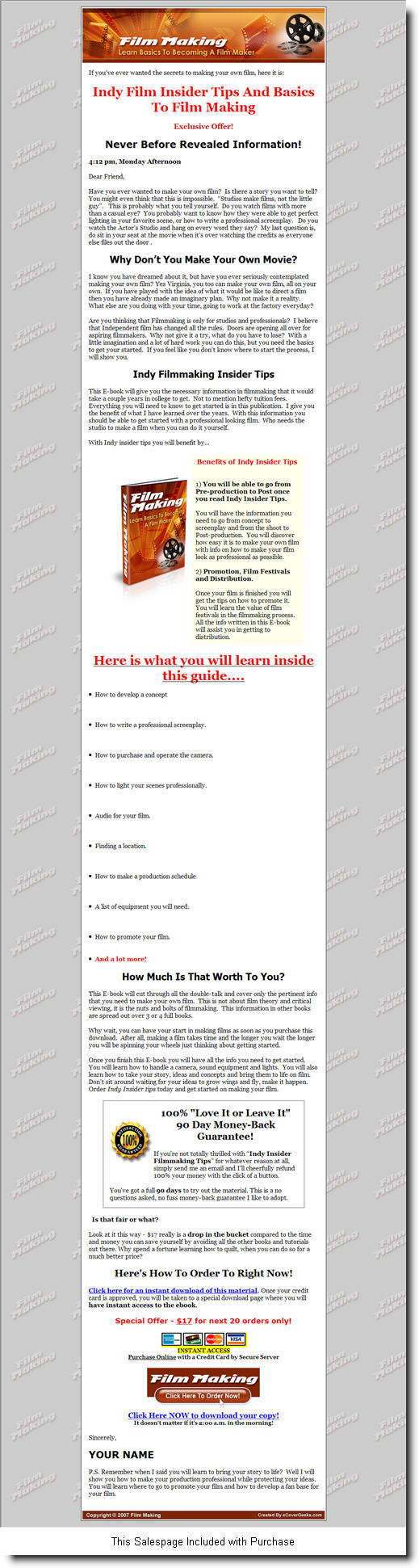This E-book will give you the necessary information in filmmaking that it would take a couple years in college to get. Not to mention hefty tuition fees. Everything you will need to know to get started is in this publication. I give you the benefit of what I have learned over the years. With this information you should be able to get started with a professional looking film. Who needs the studio to make a film when you can do it yourself.