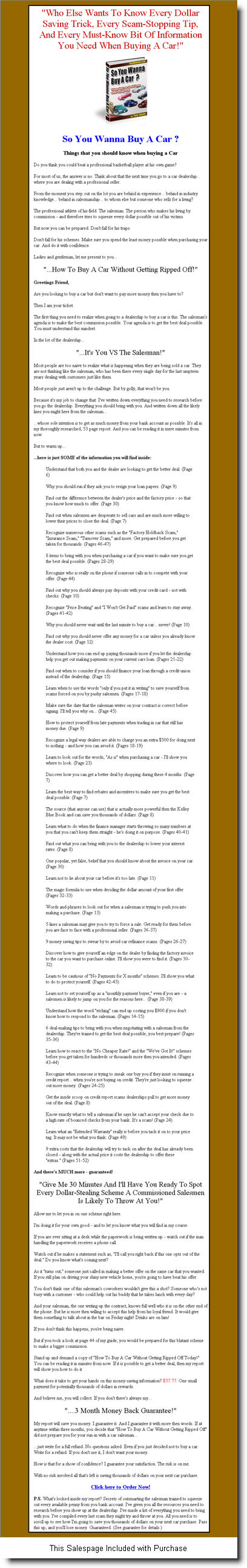 And there's MUCH more - guaranteed! "Give Me 30 Minutes And I'll Have You Ready To Spot Every Dollar-Stealing Scheme A Commissioned Salesmen Is Likely To Throw At You!" Allow me to let you in on one scheme right here. I'm doing it for your own good - and to let you know what you will find in my course. If you are ever sitting at a desk while the paperwork is being written up - watch out if the man handling the paperwork receives a phone call. Watch out if he makes a statement such as, "I'll call you right back if this one opts out of the deal." Do you know what's coming next? As it "turns out," someone just called in making a better offer on the same car that you wanted. If you still plan on driving your shiny new vehicle home, you're going to have beat his offer. You don't think one of this salesman's coworkers wouldn't give this a shot? Someone who's not busy with a customer - who could help out his buddy that he takes lunch with every day? And your salesman, the one writing up the contract, knows full well who it is on the other end of the phone. But he is more then willing to accept this help from his loyal friend. It would give them something to talk about in the bar on Friday night! Drinks are on him! If you don't think this happens, you're being naive. But if you took a look at page 44 of my guide, you would be prepared for this blatant scheme to make a bigger commission. Stand up and demand a copy of "How To Buy A Car Without Getting Ripped Off Today!" You can be reading it in minutes from now. If it is possible to get a better deal, then my report will show you how to do it. My report will save you money. I guarantee it. And I guarantee it with more then words. If at anytime within three months, you decide that "How To Buy A Car Without Getting Ripped Off" did not prepare you for your run-in with a car salesman... ...just write for a full refund. No questions asked. Even if you just decided not to buy a car. Write for a refund. If you don't use it, I don't want your money. How is that for a show of confidence? I guarantee your satisfaction. The risk is on me. With no risk involved all that's left is saving thousands of dollars on your next car purchase. P.S. What's locked inside my report? Secrets of outsmarting the salesman trained to squeeze out every available penny from you bank account. I've given you all the resources you need to research before you show up at the dealership. I've made a list of everything you need to bring with you. I've compiled every last scam they might try and throw at you. All you need is to scroll up to see how I'm going to save you thousands of dollars on your next car purchase. Pass this up, and you'll lose money. Guaranteed. (See guarantee for details.) |