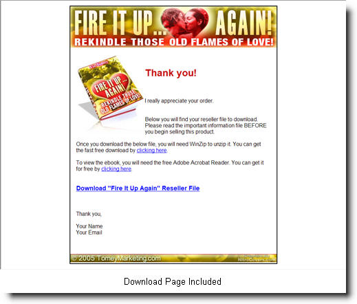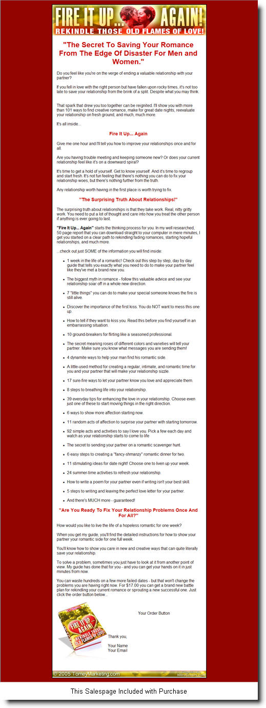 "Fire It Up... Again" starts the thinking process for you. In my well researched, 50 page report that you can download straight to your computer in mere minutes, I get you started on a clear path to rekindling fading romances, starting hopeful relationships, and much more.