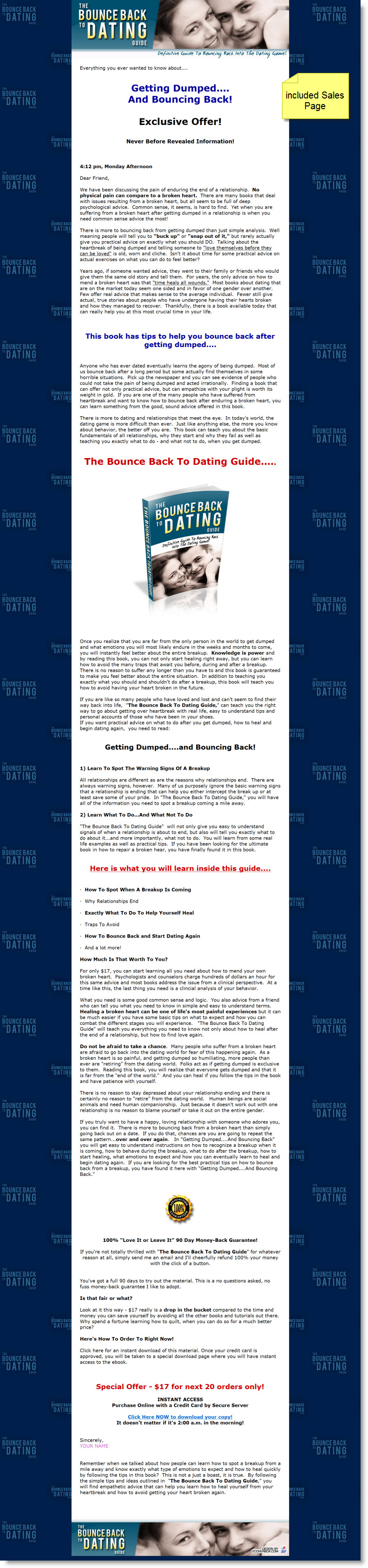 "The Bounce Back To Dating Guide" will not only give you easy to understand signals of when a relationship is about to end, but also will tell you exactly what to do about it...and more importantly, what not to do. You will learn from some real life examples as well as practical tips. If you have been looking for the ultimate book in how to repair a broken hear, you have finally found it in this book.