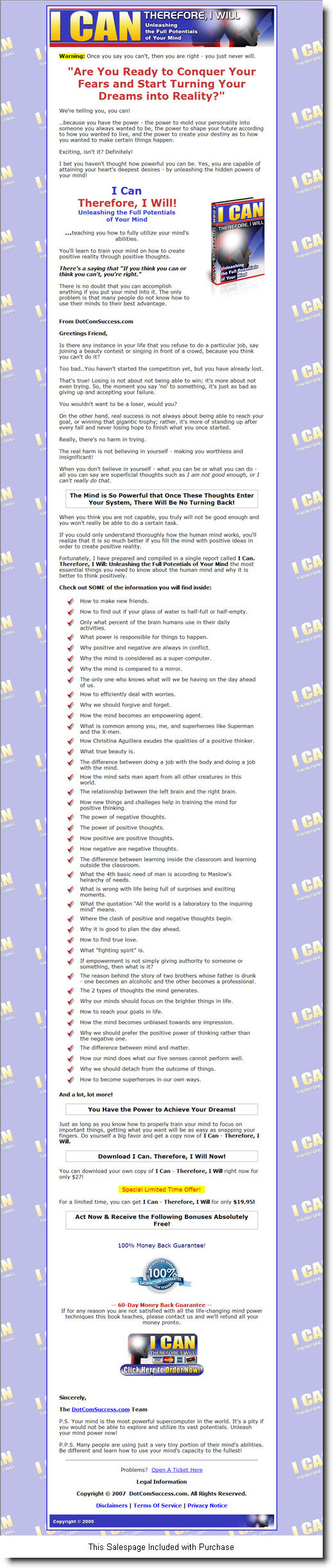 Fortunately, I have prepared and compiled in a single report called I Can. Therefore, I Will: Unleashing the Full Potentials of Your Mind the most essential things you need to know about the human mind and why it is better to think positively.