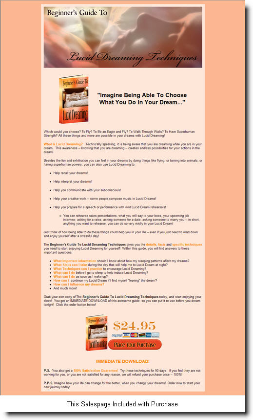 The Beginner's Guide To Lucid Dreaming Techniques gives you the details, facts and specific techniques you need to start enjoying Lucid Dreaming for yourself! Within this guide, you will find answers to these important questions: