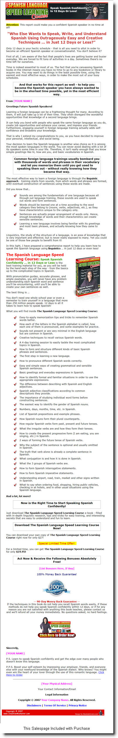 The Spanish Language Speed Reading Course “Who Else Wants to Speak, Write, and Understand Spanish Using Outrageously Easy and Creative Techniques … in Just 12 Days or Less?” Only 12 days in your hectic schedule is what you need to allot in order to become an efficient Spanish speaker or conversationalist. You don’t believe it? First of all, I am aware of the fact that people’s lives are getting busier and busier everyday. We are forced to fit tons of activities in a day. Sometimes there’s no time left for ourselves. Time is indeed essential to most of us. The fact that you’re canvassing Spanish books in the internet means you have no time to go to any bookstore or library to acquire one. You may want to do things in the least possible time, using the easiest and most effective ways, in order to make the most out of your busy schedules. And that works for this report as well – to help you become the Spanish speaker you have always wanted to be in the shortest time possible, yet in the most efficient way. Learning a foreign language can be a frightening thought for many. According to them, it will just take up a lot of their time. They often disregard the wonderful opportunities that knowledge of a second language brings. It can help you bond with people who speak the same foreign language as you do, create job opportunities and enhance your career, and impress your friends. Furthermore, engaging yourself in foreign language training actually adds self-confidence and broadens your knowledge. That is why I extend my congratulations to you, as you have decided to improve your personal, intellectual, and social being. Your decision to learn the Spanish language is another wise choice as it is among the most spoken languages in the world. You can never avoid dealing with a lot of its speakers some time in your life. Therefore, it isn’t really enough that you know simple greetings like hi, how are you, and basic vocabularies in Spanish. Common foreign language trainings usually bombard you with thousands of words and phrases in their vocabulary and let you memorize them until you get used to speaking them out – without really knowing how they became that way. The most effective way to learn a foreign language is through the linguistic approach – training starts from sounds, from which words and phrases are formed, until eventual construction of sentences using these words are made. Did you know that… ü Sounds are among the fundamentals of one language because all through out language training, these sounds are used to speak out words and form sentences. ü Words should be learned one at a time according to the word category they belong to (nouns, verbs, adjectives, etc.), as they have characteristics unique to the category only. ü Sentences are actually proper arrangement of words only. Hence, enough knowledge of words and their characteristics can create sensible sentences. ü Learning a new language involves being familiar with its greetings and most basic phrases, and actually knowing how they came to be. Linguistics, the study of the structure of a language, is an area of knowledge that is very important and effective; but is never really exposed to many. Yet you could be one of those few people to benefit from it! In this light, I have prepared a comprehensive report to help you learn how to speak the Spanish language using linguistics … in just 12 days or even less! “The Spanish Language Speed Learning Course: Speak Spanish Confidently … in 12 Days or Less” is the best training material for you, as you will be held by the hand each step of the way - from the basics up to the complicated topics in Spanish. With pronunciation guides, accurate glosses, and ample examples, you will never have any problem understanding each Spanish word and sentence you’ll be encountering, until you’ll be able to create your own sentences as well. The best thing is … You don’t need one whole school year or even a semester to train yourself in a language that more than 250 million people speak. 12 days is all it takes to learn how to speak Spanish! What you will find inside The Spanish Language Speed Learning Course: ü Easy-to-apply memorization tips and tricks to remember Spanish words better. ü How each of the letters in the Spanish alphabet is called, how each one of them is pronounced, and some examples for practice. ü Sounds not present or are very minimal in the English language but are common in Spanish. ü Creative techniques to recall various Spanish words. ü A 4-day training session to easily tackle the most complicated topics in Spanish. ü How to form and structure different kinds of basic Spanish phrases and sentences. ü The first step in learning a new language. ü How to pronounce different Spanish words correctly. ü Easy and simple ways of creating grammatical and sensible Spanish sentences. ü Basic greetings and everyday expressions in Spanish ü How to identify formal and familiar situations in order to use the appropriate expressions. ü The difference between describing with Spanish and English adjectives. ü Spanish adjective classifications according to common descriptions they provide. ü The importance of studying individual word forms before constructing sentences. ü The easiest way to identify the gender of Spanish nouns. ü Numbers, days, months, time, etc. in Spanish. ü List of Spanish prepositions and example phrases. ü How Spanish nouns form their plural counterparts. ü How regular Spanish verbs form past, present and future tenses. ü What the irregular verbs are and how they form their tenses. ü How to create the present progressive form (I am eating, you are singing, etc.) in Spanish. ü 2 ways of forming the future tense of Spanish verbs. ü Why the subject of the sentence is optional and usually omitted in Spanish. ü The truth that verb alone is already a complete sentence in Spanish. ü What conjugation is and how it is d
