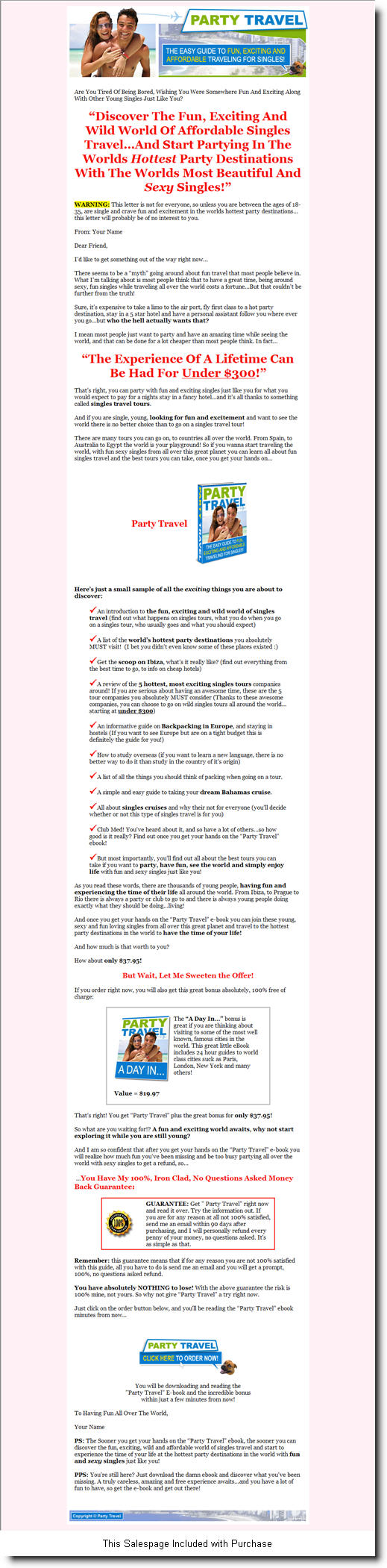 And once you get your hands on the "Party Travel" e-book you can join these young, sexy and fun loving singles from all over this great planet and travel to the hottest party destinations in the world to have the time of your life!