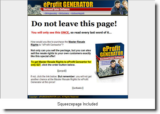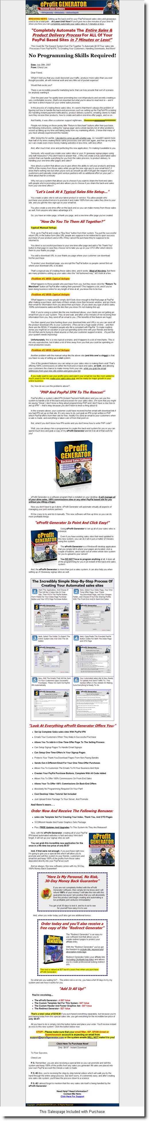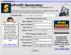Even if you have existing sales sites that need updated to this new system, you can do it all in just a matter of minutes using this system. The eProfit Generator is a Windows® desktop application that you simply tell it where your pages are located, click a couple of buttons, and it spits out an entire whole new system for you to upload to your server! You DO NOT have to program anything at all, it does all of the programming for you in an instant of the back-end sales system. And, the eProfit Generator is more than just a sales system, it can also help you when setting up JV Giveaway signup sites as well."