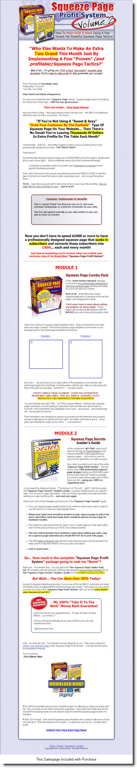 Squeeze Page Combo pack # 2 "Who Else Wants To Make An Extra Two Grand This Month Just By Implementing A Few "Proven" (and profitable) Squeeze Page Tactics?" Best of all... I'm giving you TWO unique "eye-poppin" squeeze page templates PLUS a step-by-step guide to help guarantee your success!