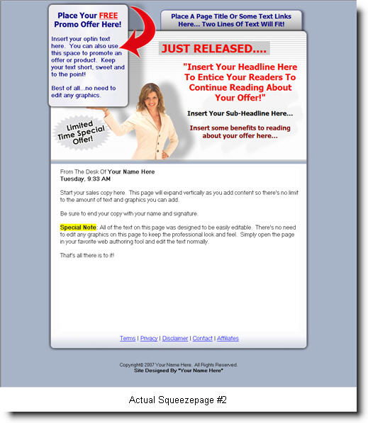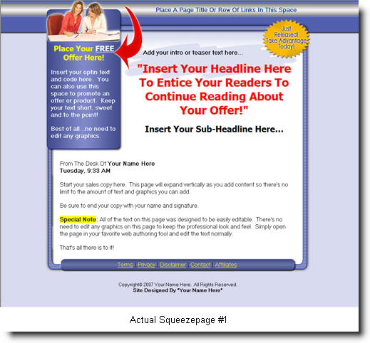 MODULE 1 Squeeze Page Combo Pack In this "never before released" package you'll receive two professionally designed and optimized squeeze pages all setup and ready for you to just add your content. Best of all... what makes this combo squeeze page pack so amazing is the way the pages were designed and setup. You'll never have to worry about editing any graphics on these pages. These pages were professionally designed with the NOVICE (as well as the professional) in mind! | Take a look at the two squeeze page templates at the top of this page. Keep in mind that the two links below are simply "Images" of the actual squeeze page templates you'll receive in your package (and not the actual page templates themselves). Nice huh? ... All you'll need to do is open either of the templates in your favorite web authoring program like FrontPage or Dreamweaver, edit the text, add your autoresponder form in the optin box provided... and that's it... Your job is done! EVERY SINGLE PAGE ELEMENT - EVEN THE ATTRACTIVE HEADLINES AND LINKS - ARE ALL SIMPLE, EDITABLE TEXT! ABSOLUTELY NO GRAPHICS EDITING REQUIRED!