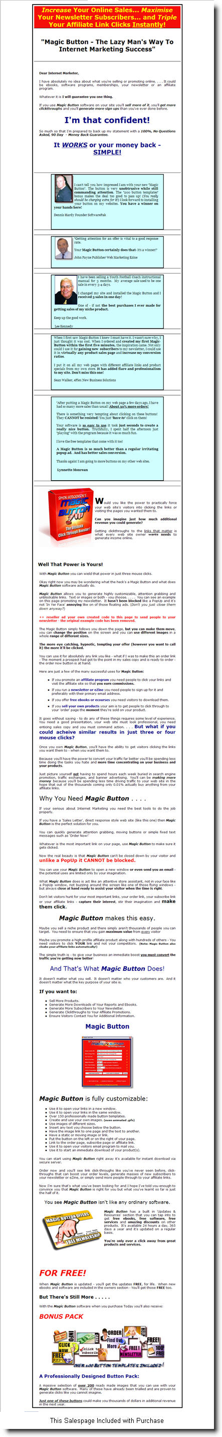 Would you like the power to practically force your web site's visitors into clicking the links or visiting the pages you wanted them to. Can you imagine just how much additional revenue you could generate? Getting clickthroughs to the links that matter is what every web site owner wants needs to generate income online. Well That Power is Yours! With Magic Button you can wield that power in just three mouse clicks. Okay right now you may be wondering what the heck's a Magic Button and what does Magic Button software actually do. Magic Button allows you to generate highly customizable, attention grabbing and unblockable links. Text or images or both - you choose. . . . . You can see an example on this page promoting my newsletter. It hasn't been blocked like a PopUp and it's not 'In Yer Face' annoying like on of those floating ads. (Don't you just close them down anyway?) ++ reseller ad your own created code to this page to send people to your newsletter - the original example code has been removed. The Magic Button simply follows you down the page, but you can make them move, you can change the position on the screen and you can use different images in a whole range of different sizes. The more eye catching, hypnotic, tempting your offer (however you want to call it) the more it'll be clicked. You can use it for absolutely any link you like - what if I was to make this an order link - The moment a prospect had got to the point in my sales copy and is ready to order - the order now button is at hand. Here are just a few of the many successful uses forMagic Button: If you promote an affiliate program you need people to click your links and visit the affiliate site so that you earn commissions. If you run a newsletter or eZine you need people to sign up for it and preferably with their primary email address. If you offer free ebooks or ecourses you need visitors to download them. If you sell your own products your aim is to get people to click through to your 'order' page the moment they're sold on your product.