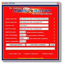 It goes without saying - to do any of these things requires some level of experience. You need a good presentation, your web site must look professional, you need enticing sales copy and you must command action. . . . But what if you could acheive similar results in just three or four mouse clicks? Once you own Magic Button, you'll have the ability to get visitors clicking the links you want them to - when you want them to. Because you'll have the power to convert your traffic far better you'll be spending less time doing the tasks you hate and more time concentrating on your business and your products. Just picture yourself not having to spend hours each week buried in search engine promotion, traffic exchanges, and banner advertising. You'll can be making more money because you'll be spending less time driving traffic to your web site in the hope that out of the thousands coming only 0.01% actually buy anything from your affiliate links. Why You Need Magic Button . . . . If your serious about Internet Marketing you need the best tools to do the job properly. If you have a 'Sales Letter', direct response style web site (like this one) then Magic Button is the perfect solution for you. You can quickly generate attention grabbing, moving buttons or simple fixed text messages such as 'Order Now!' Whatever is the most important link on your page, use Magic Button to make sure it gets clicked. Now the real beauty is that Magic Button can't be closed down by your visitor and unlike a PopUp it CANNOT be blocked. You can use your Magic Button to open a new window or even send you an email - the potential uses are limited only by your imagination. What Magic Button does is act like an attentive store assistant, not in your face like a PopUp window, not buzzing around the screen like one of those flying windows - but always close at hand ready to assist your visitor when the time is right. Don't let visitors hunt for your most important links, your order link, your subscribe link or your affiliate links - capture their interest, stir their imagination and make them click. Magic Button makes this easy. Maybe you sell a niche product and there simply aren't thousands of people you can target. You need to ensure that you gain maximum value from every visitor Maybe you promote a high profile affiliate product along with hundreds of others - You need visitors to click YOUR link and not your competitors. (Note: Magic Button also cloaks your affiliate links automatically!) The simple truth is - to give your business an immediate boost you must convert the traffic you're getting now better! And That's What Magic Button Does! It doesn't matter what you sell. It doesn't matter who your customers are. And it doesn't matter what the key purpose of your site is. If you want to: Sell More Products. Generate More Downloads of Your Reports and Ebooks. Generate More Subscribers to Your Newsletter. Generate Clickthroughs to Your Affiliate Promotions. Ensure Visitors Contact You for Additional Information.