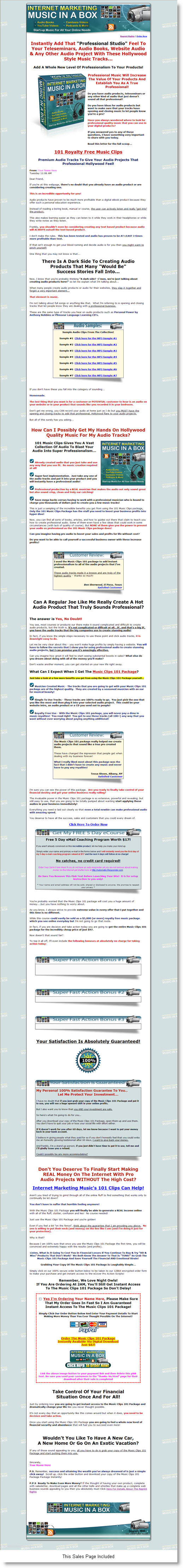 This is just a sampling of the incredible benefits you get from using the 101 Music Clips package. Only the 101 Music Clips Package has the stuff you need to boost your business profits into hyper dive!